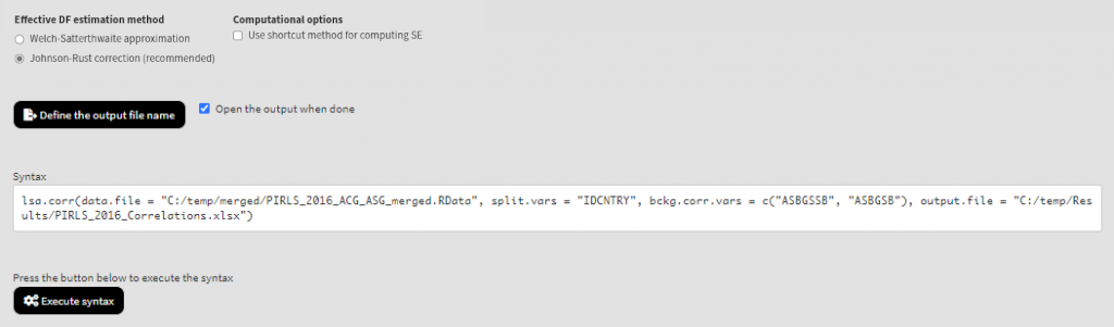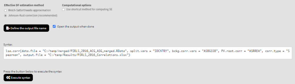 As a start, let’s compute the correlation coefficient between two background scales – Students’ Sense of School Belonging (ASBGSSB) and Students Being Bullied (ASBGSB) in Australia and Slovenia (check the PIRLS 2016 technical documentation on how these scales are constructed and their properties). Select variables ASBGSSB and ASBGSB from the list of Available variables and add them to the list of Background continuous variables using the right arrow button. This is all that needs to be done. Scroll down and click on the Define output file name. Navigate to the folder C:/temp/Results (or to the folder where you want to save the output) and define the output file name. After you do so, a checkbox will appear next to the Define the output file name. If ticked, the output will open after all computations are finished. Underneath the calling syntax will be displayed. Under all of these the Execute syntax button will be displayed. The final settings in the lower part of the screen should look like this: