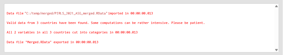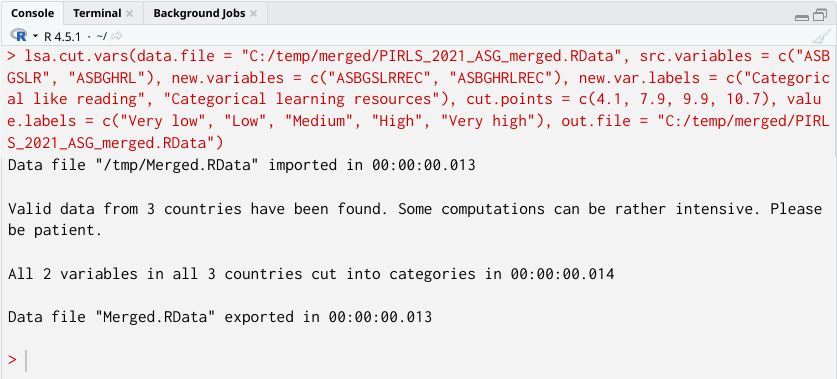 As we now have the data from these two countries merged, we will cut the PIRLS 2021 Students Like Reading (ASBGSLR) and the Home Resources for Learning (ASBGHRL). The variables for these two scales in the database are continuous. Multiple variables can be cut into discrete ones at the same time, as in this example. In cutting them into discrete variables, we will assign labels for the discrete categories, as well as variable labels. Note that, as explained in the previous section, if we omit the new value labels, the resulting variables will contain numeric (integer) values. If these are provided, the variables will be set to categorical (factor) ones. If variable labels are provided, these will be assigned as descriptive labels for these variables. If omitted, the variable labels will be copied over from the source variables, adding “Cut” at the very front. The syntax below provides all these details. The source data file is overwritten with the data containing these two discretized variables.