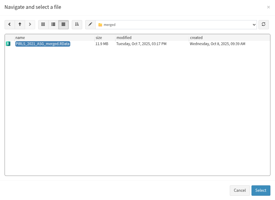 In the examples that follow we will merge a new data file (see how to merge files here) with student data from PIRLS 2021 (Australia and Slovenia), taking all variables from both file types:
