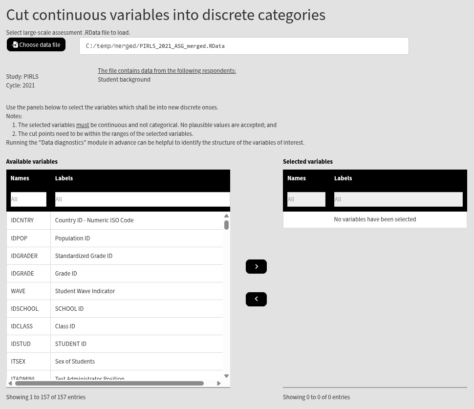 When done merging the data, select Data preparation > Cut variables from the menu on the left. When navigated to the Cut variables in the GUI, click on the Choose data file button. Navigate to the folder containing the merged PIRLS_2021_ASG_merged.RData file, select it and click the Select button.
