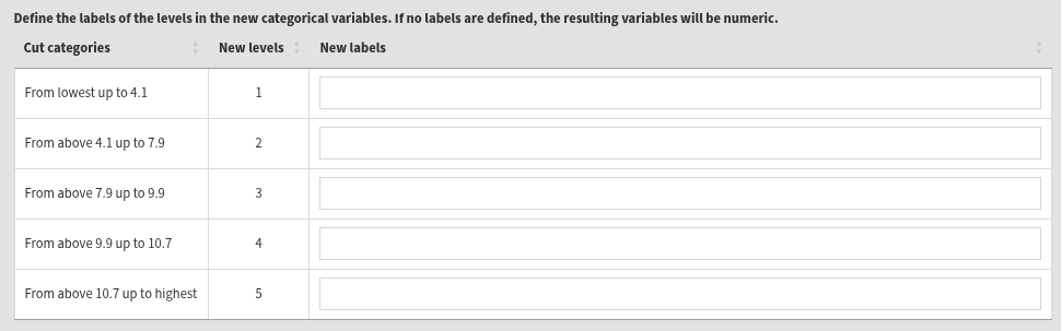 In the text box, enter the cut points that will define the new categories. For this example, let’s enter 4.1, 7.9, 9.9, and 10.7. Enter them divided by spaces, no commas or other separators. Pressing the Reset button will clear all entered values. After entering the values, the following elements will appear: