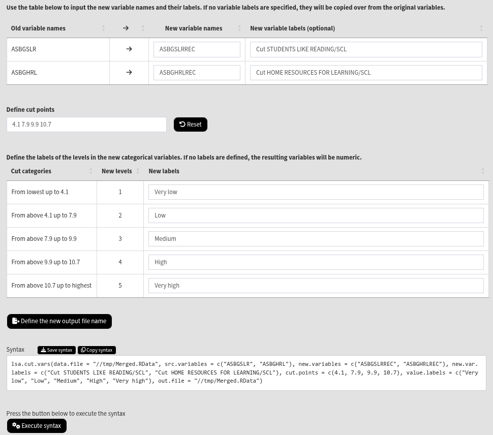 The table shows what will be the new categories will be. The new categories will be defined in ranges, according to the cut points, from below the lowest cut point to above the highest cut point. If no value labels are defined in the last column, the resulting new variables will be numeric (integers). If new value labels are defined, the resulting new variables will be categorical (factors). Enter the following labels from top to bottom: “Very low”, “Low”, “Medium”, “High”, and “Very high”. Press the Define the new output file name button, navigate to the folder where you want to save the new data file, define the file name and click on the Save button. In this case, we will define the same file name as the source file in the same location. This will overwrite the file, adding the new variables to it. The final screen should look like the image below: